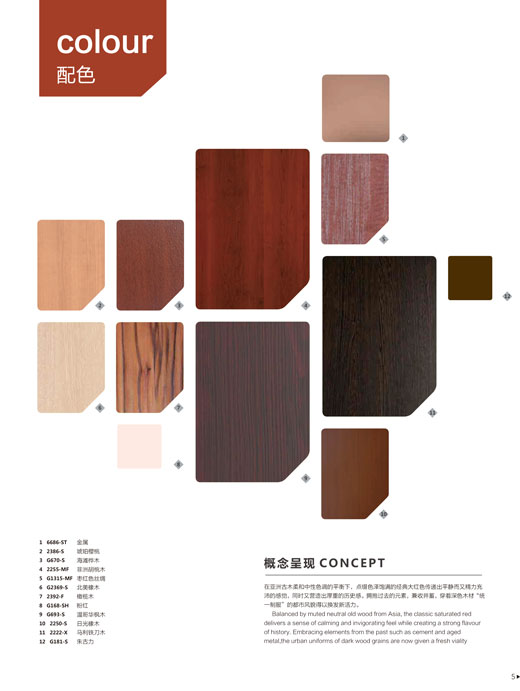 格林雅在產(chǎn)品開(kāi)發(fā)設(shè)計(jì)上充分的考慮到顧客的需求,以“追求經(jīng)典時(shí)尚、品味高雅、精益求精”的理念,不斷推陳出新,至2015年已經(jīng)有5000多種花色及55種表面處理。以富有想象力的色彩和新穎的表面處理展現(xiàn)著現(xiàn)代流行趨勢(shì),成為設(shè)計(jì)大師們?cè)趧?chuàng)作是的靈感源泉;