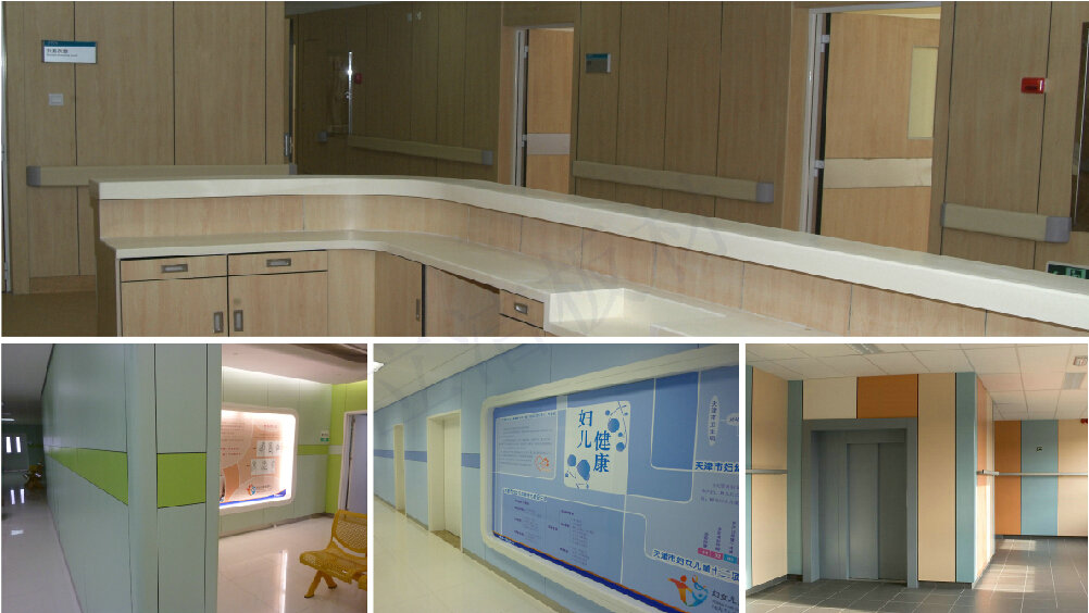掛墻板的應用很廣泛,例如,最常遇見的醫院,快餐店,地鐵站,這些人流密集的地方,都會用到這種材料。掛墻板實則為抗倍特板,但是一般比抗倍特板有著更豐富的特殊優點,是由多層含浸三聚氰胺和酚醛樹脂的牛皮紙經過高溫高壓制成,還可加上表面色紙,使其滿足顏色需求。厚度可以根據需求,從1.6-25mm厚度,可以作為裝飾材料,也可以作為結構材料,及其的耐沖擊的特性。